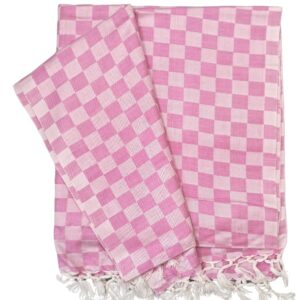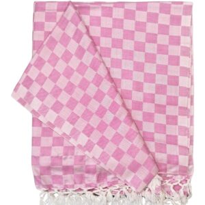 - Design: Classic checkerboard pattern with delicate tassels/fringes on the edges (single/medium check).