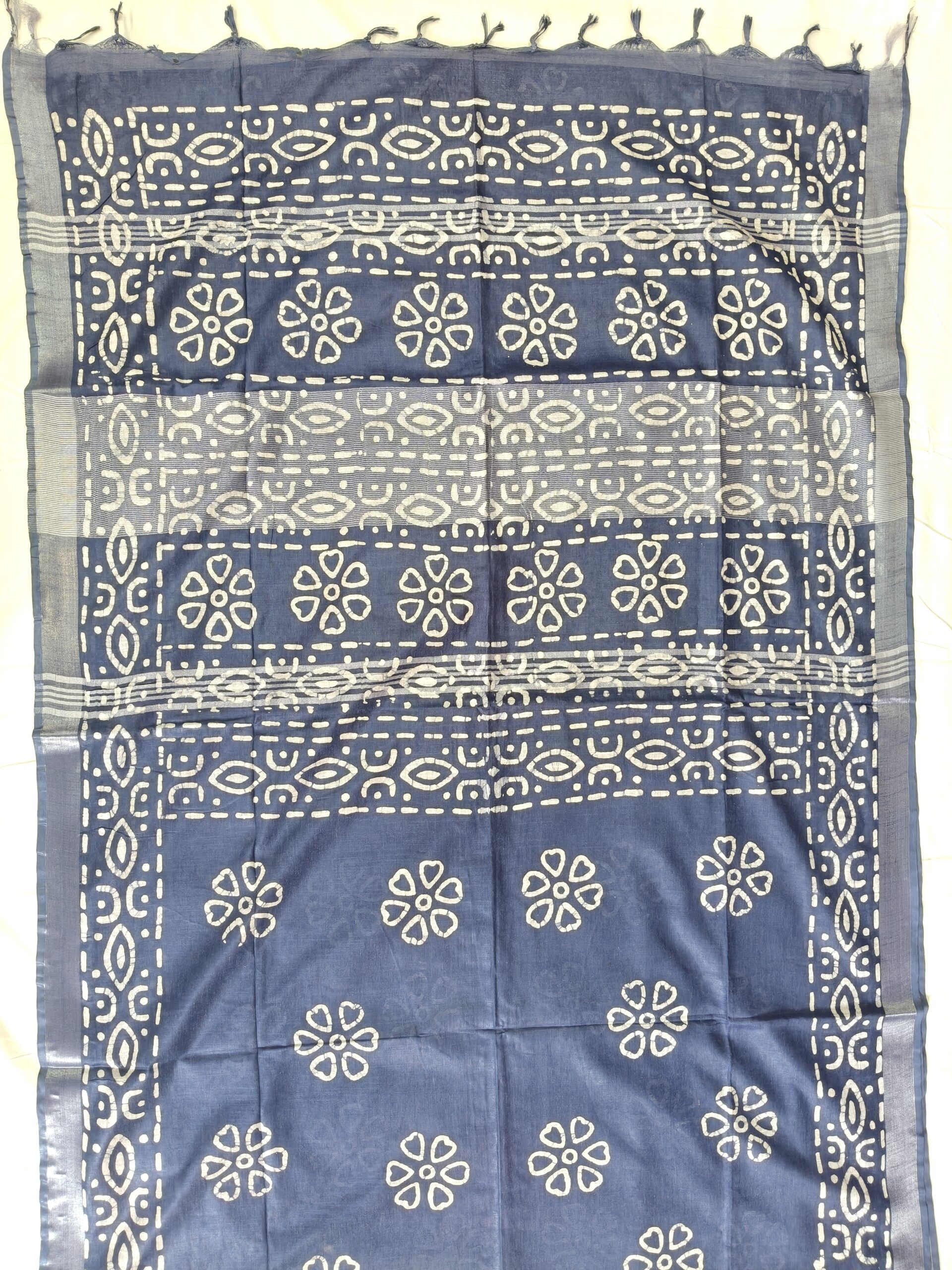 Pure Cotton Hand Block Batik Print Saree With Blouse Pcs-Navy Blue